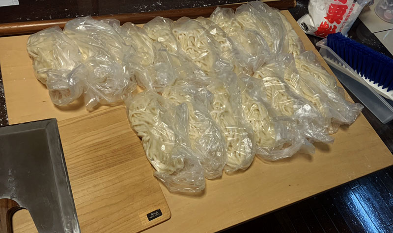 うどん体験は4グループでそれぞれ500gのうどん打ち体験をし、そのうどんを厨房で茹でて試食します。
